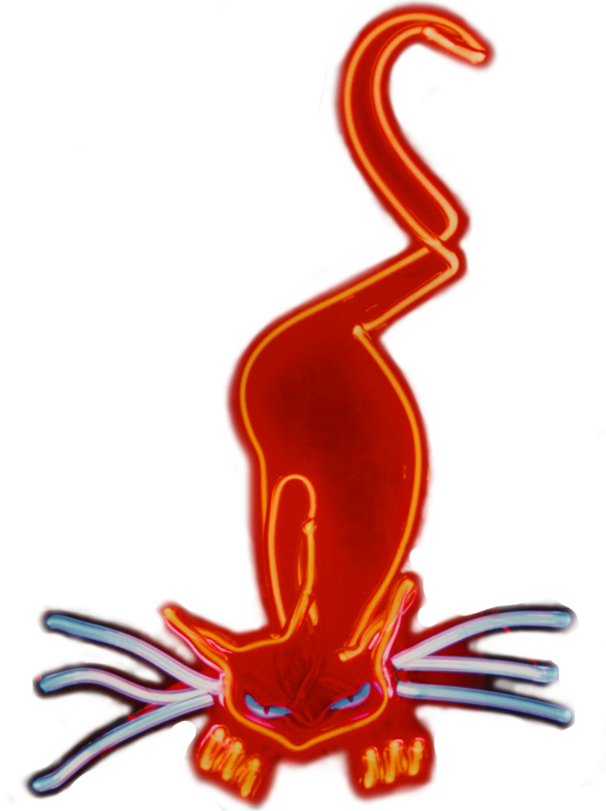 Cat ! neon was commissioned by Bob Brunk (author and antiques auction house proprietor) in 2001 to be given as a holiday gift.. It’s about 24″ tall.. Neon fills the body, while argon & mercury light the whiskers.. Cobalt blue are the eyes.. Everybody loves this one…